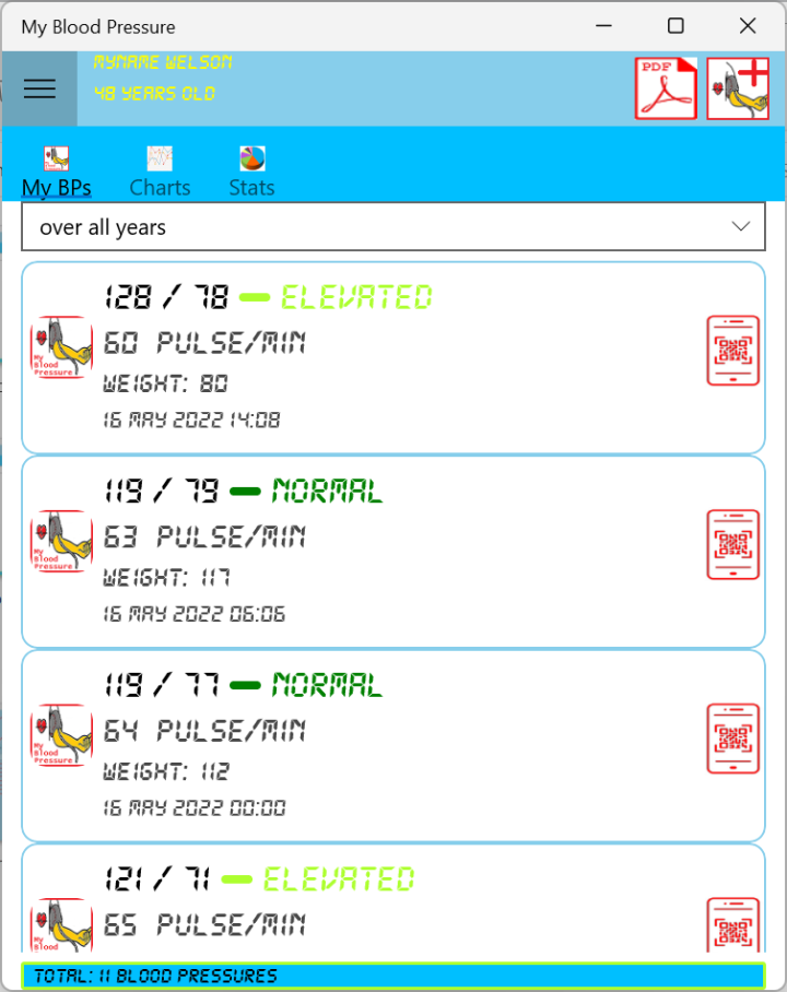 After adding many blood pressure readings, the app shows them the same as in Image12.