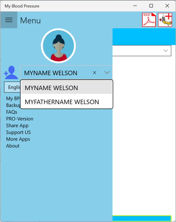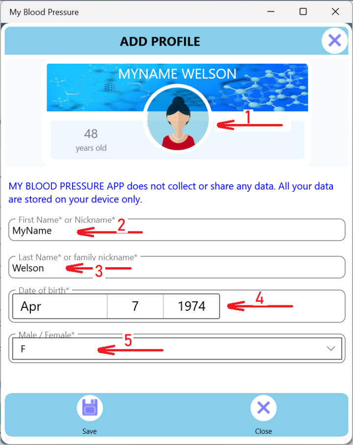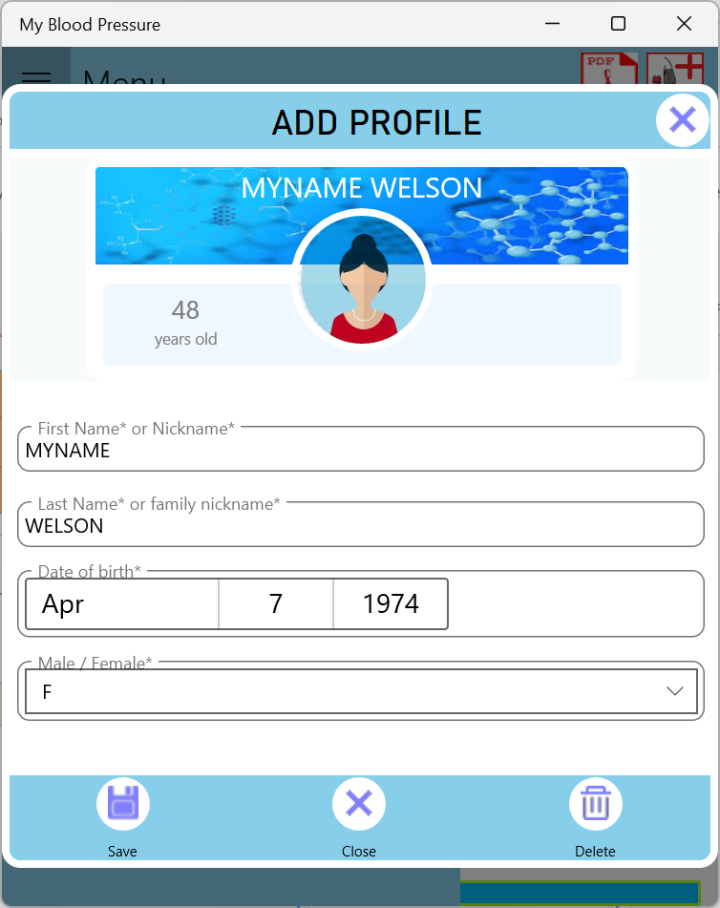 NOTE: There is no limit to adding profiles. you can for example enter a profile for yourself, your father, your mother or anyone you would to track its blood pressure readings.